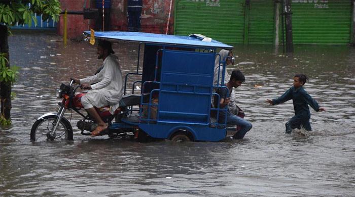 People can be seen passing through accumulated water on a road during rain in Lahore on July 12. 2024. — APPMonsoon currents to penentrate from Arabian Sea, Bay of Bangal.Rains expected to continue across country until July 27, says NDMA.NDMA asks public to remain vigilant, follow...