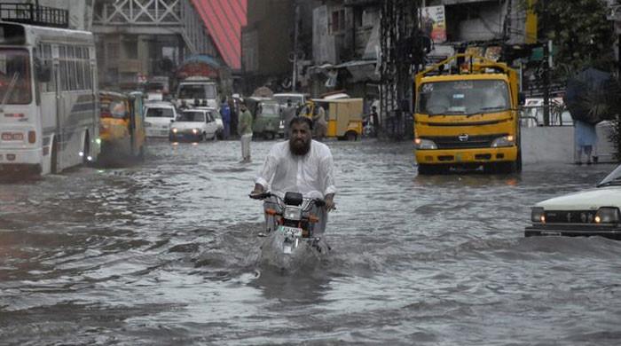 A man rides on a motorcycle amid flood waters along a road during the monsoon season in Rawalpindi, Pakistan July 19, 2023. — Reuters