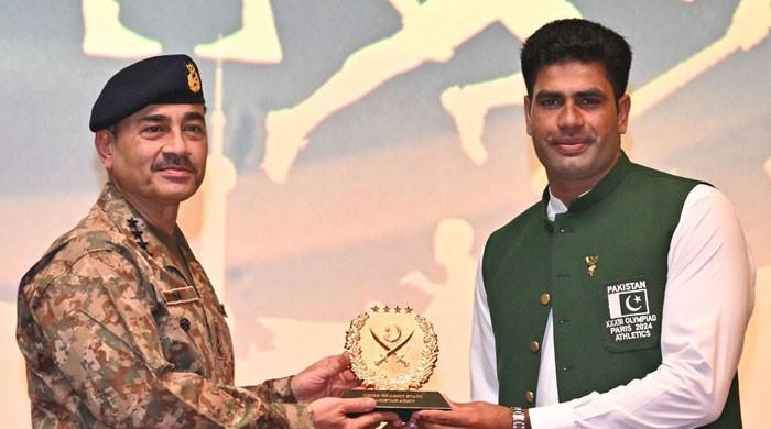 Chief of Army Staff General Syed Asim Munir honours Olympian Arshad Nadeem during a ceremony at Army Auditorium GHQ in Rawalpindi on August 16, 2024. — ISPR
