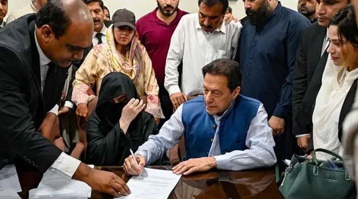 PTI founder Imran Khan pictured along with his wife Bushra Bibi as he signs surety bonds for bail in various cases, at the registrar's office in the Lahore High Court on July 17, 2023. — AFP