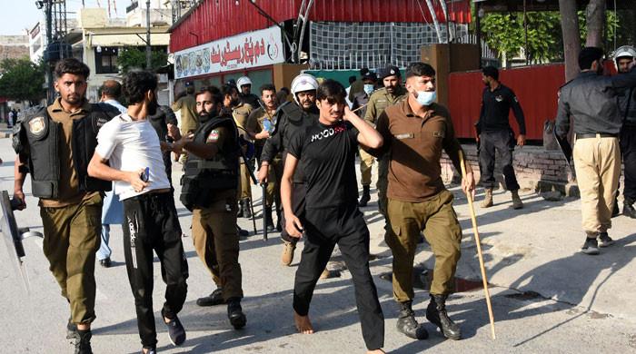 Punjab police personnel arrest PTI supporters and activists during a protest in Rawalpindi on September 28, 2024. — OnlineKP advocate general to be directed to take legal action: spox.Barrister Saif decries use of shelling against women workers.58 PTI leaders for vandalism, raising...