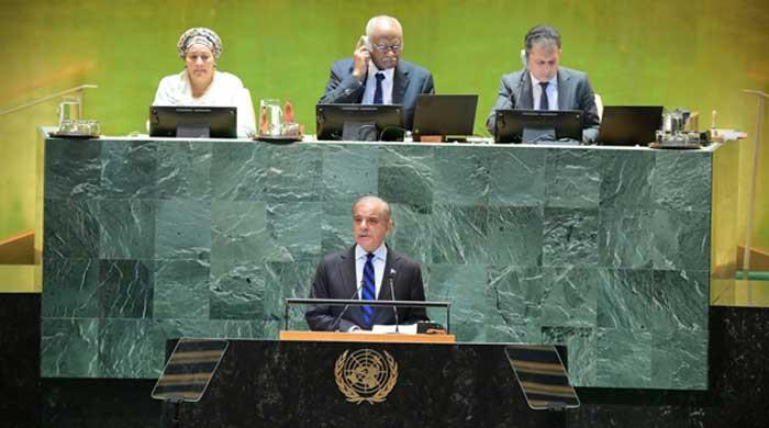 Prime Minister Shehbaz Sharif addresses the UN General Assembly in New York, US on September 27, 2024. — PID