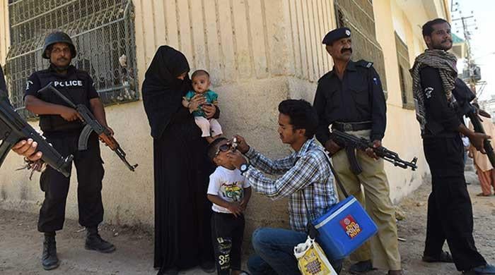 Policemen stand guard as a health worker administers polio drops to a child during a vaccination campaign against the crippling disease in Karachi. — AFP/FileUnknown gunmen open fire at polio team in Karak.Shooting martyrs policeman, injures one polio worker.Suspects gundown another...