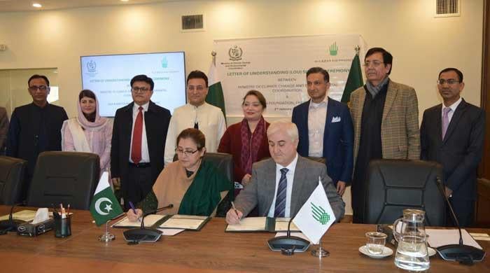 Coordinator to PM for Climate Change, Romina Khurshid Alam witnessing signing ceremony of Letter of Understanding as Secretary MoCC, Aisha Humera Moriani and CEO of AKF in Pakistan Akhtar Iqbal are signing LoU. — Provided by Aga Khan Foundation