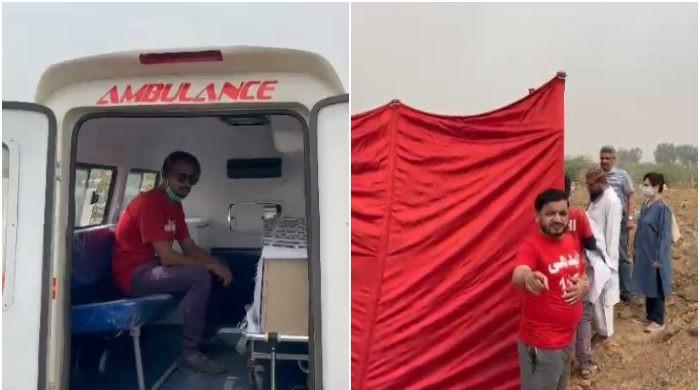 A collage showing a coffin carrying presumable remains of Mustafa Amir and rescue workers and officials at the graveyard. — ReporterMustafa Amir's mortal remains shifted to morgue.Body to be handed over to the family after DNA report.Suspect Armaghan to be produced before ATC...