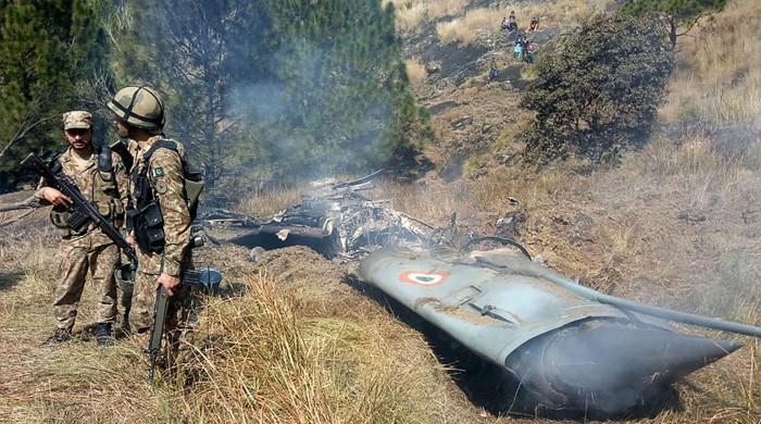 Pakistani soldiers stand next to the wreckage of an Indian fighter jet shot down in Azad Kashmir at Somani area in Bhimbar district near the Line of Control on February 27, 2019.—AFP